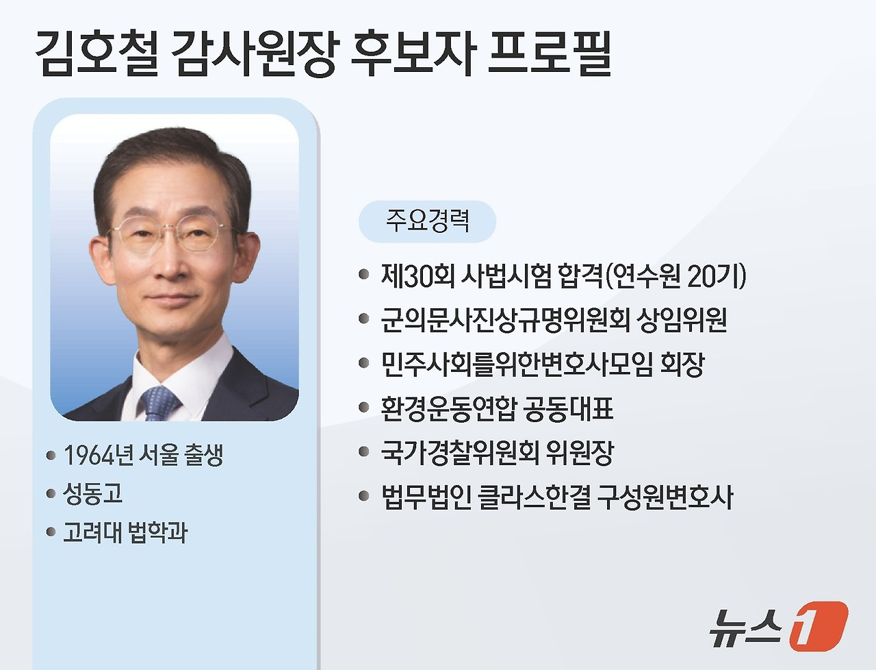 김호철 감사원장 후보자는 법조인 출신으로, 다양한 공직과 민간 활동 경력을 갖춘 인물입니다.